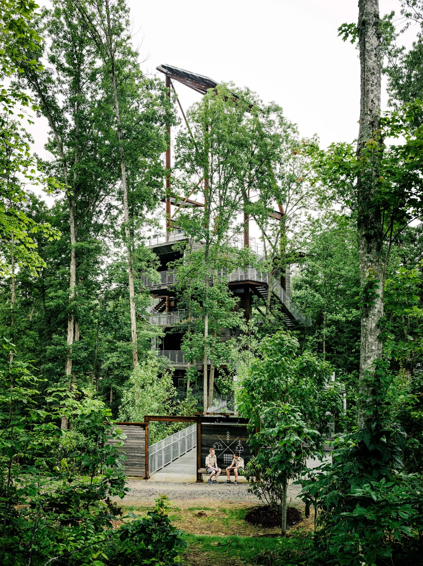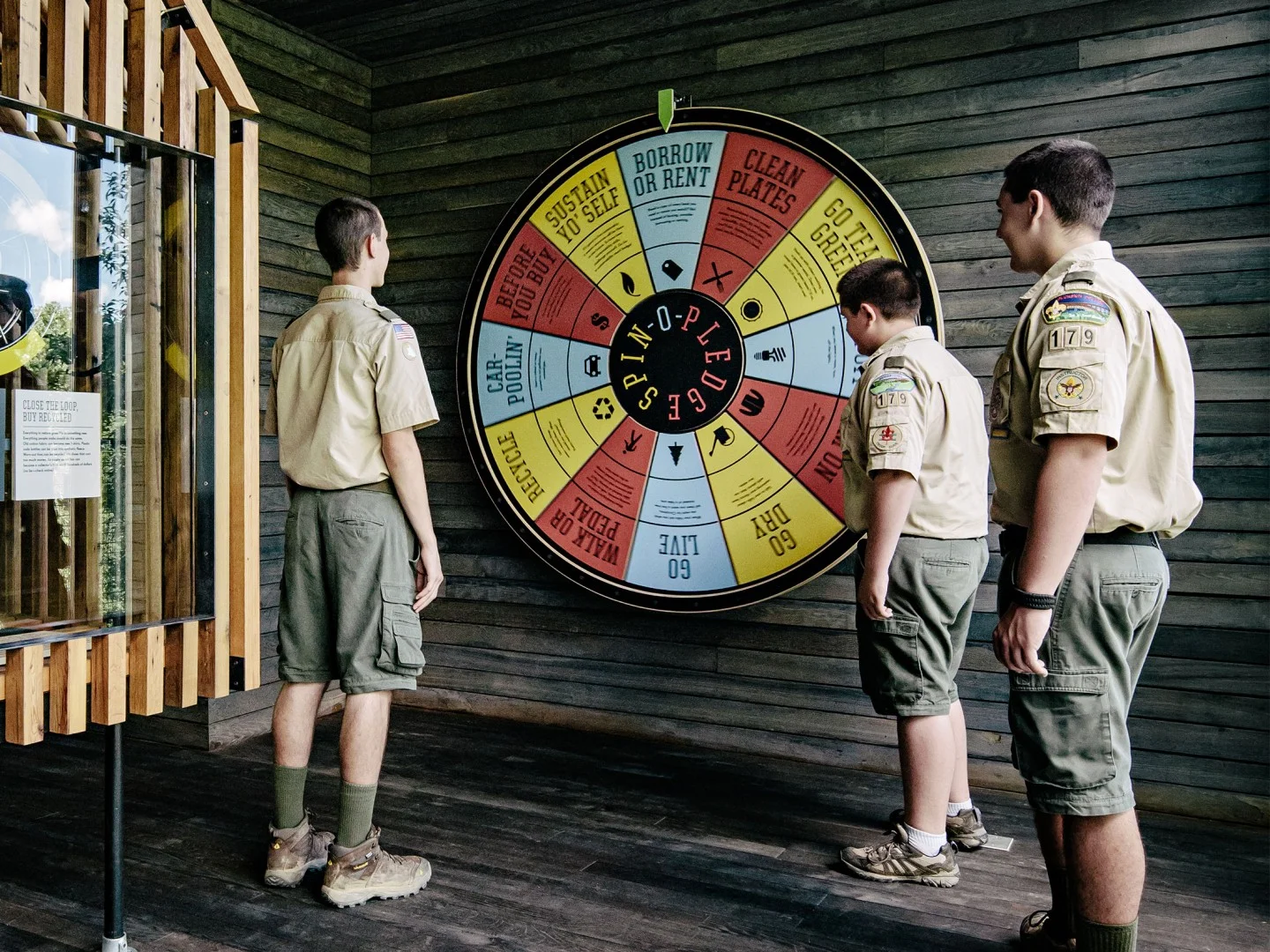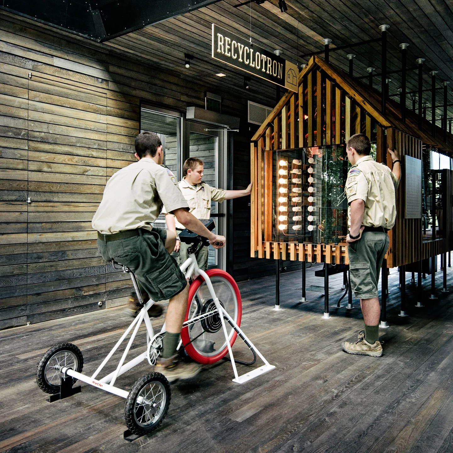 The Treehouse is a net-zero building that captures rainwater and generates its own power. All about sustainability, it was constructed on reclaimed West Virginia strip mining land by the Boy Scouts of America. The experience leads upward from ground level to the rooftop canopy, designed to engage an audience of Scouts ages 11–17 who are eager to find the next adventure activity.